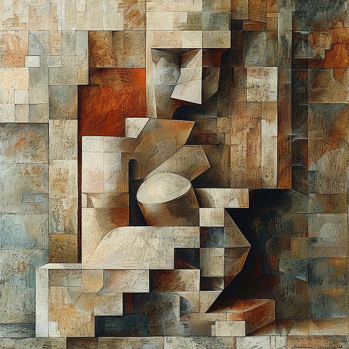 /imagine: cubism, geometric shapes, abstract, collage, multiple perspectives, monochromatic, Picasso style art, Braque style art, fragmented, dynamic compositions